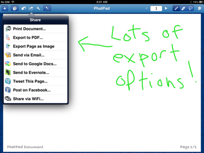 When you are done writing, you have several options for sharing your document. If you are preparing a presentation, you can use the presentation mode to export the contents to a VGA monitor. The app will send over the text, images and audio recordings. You can also save the document as a PDF, export it as an image, print it via AirPrint, share it directly via WiFi or send it as an email attachment. And that's not all — PhatPad supports several cloud syncing services like Box, Dropbox, Google Docs and Evernote.