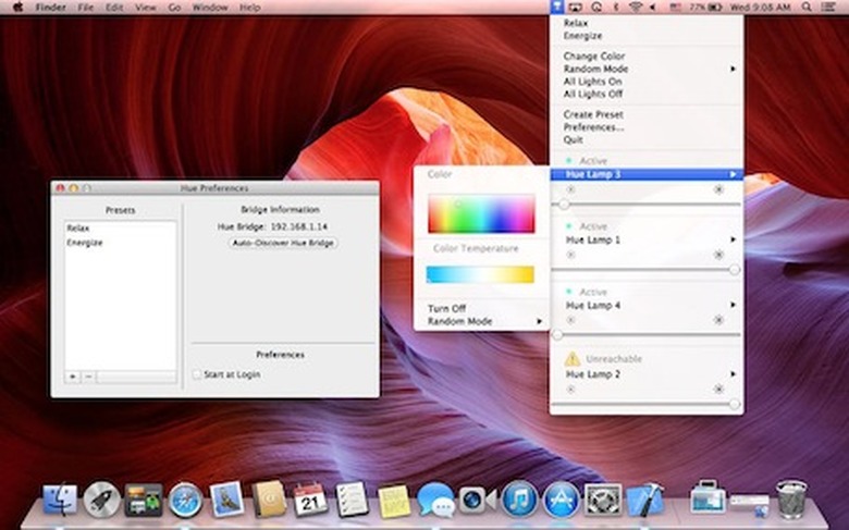 The app is a simple menu bar drop-down utility that allows users to adjust their Hue lights via several ways. For instance, you can use OS X's Color Picker to set each bulbs hue, create presets for certain lights, turn lights on and off and adjust brightness. You can even set the lights to randomly change color patterns.