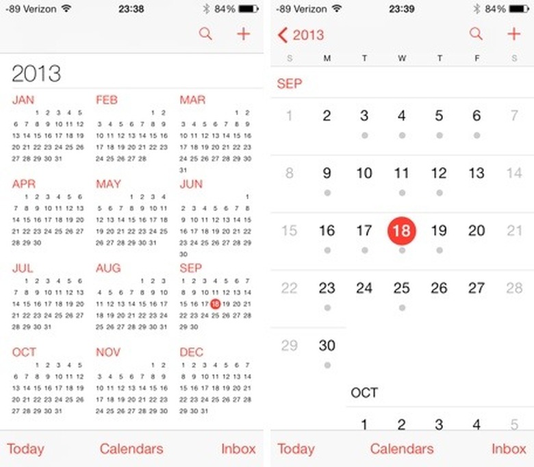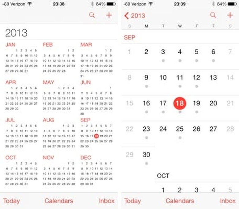 Gone is the grey-blue look in the iOS 6 version of the Calendar. Replacing it is a bleached white UI that is accented only by the black text, red navigation elements and color markers highlighting important dates. Though striking, it is minimalist to the max and my be jarring to users expecting the color splash that graces the iOS7 homescreen. The layout is easy to figure out with the calendar in the middle and controls at the top and bottom. The top controls allow you to switch from a day view, month view and year view. There's also a search button and a "+" button to add a new event. The bottom lets you jump to the current date, select which calendars to view and and an inbox to view your invitations.
