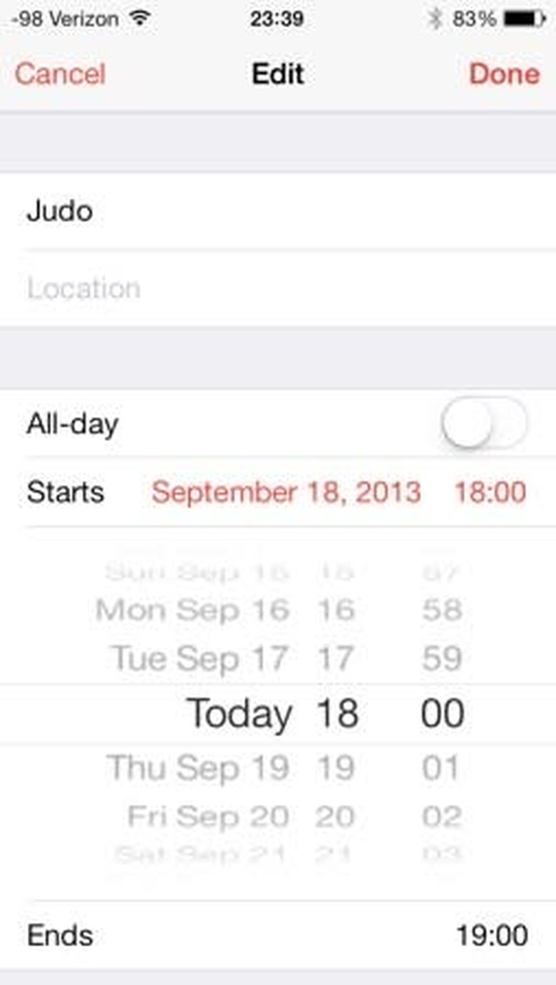 The create an event, you must tap on the red "+" symbol at the top right corner of the screen. This symbol is available in the day, month or year view. Still present is the ability to long tap on the screen to add an event, which was present in earlier versions of the calendar. Event creation is similar to iOS 6 with the same fields present in both versions of the OS. The layout in iOS 7 is slightly different with a stylish wheel-selector for the starting and ending dates/times, as shown below.