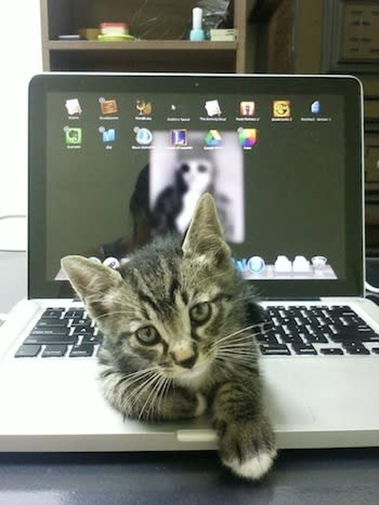 Park Junior is obviously in control of the situation here. By strategically placing his furry little body on the trackpad and keyboard, and confronting his human Theresa with that stare, he's made darned sure that she's not going to get any work done. Theresa says that "he was very displeased that I wasn't spending all of my time playing with him."