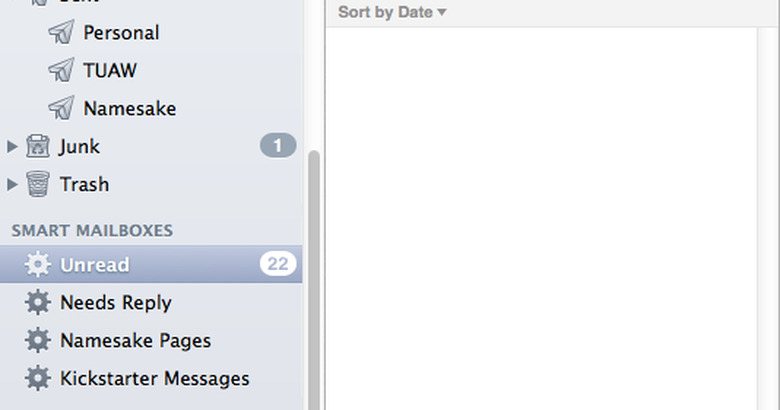 While I managed to escape Kissell's issue of having all three of my Gmail accounts download everything again, my smart mailboxes proceeded to break. It kept telling me I had numerous unread messages, but nothing was showing in the mailbox. In the screencap above, you can see the smart mailbox selected but nothing in the mailbox itself. When I checked the rules for that smart mailbox, it had a lot of blank rules that weren't there before. I deleted them, but the smart mailbox still didn't work.