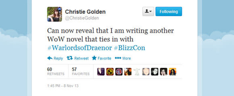 Amidst all the BlizzCon excitement yesterday, author Christie Golden decided to drop an interesting bit of information on Twitter — she's working on a new novel. Not just any novel, but a WoW novel that ties in with the new expansion, Warlords of Draenor. Obviously no title or plot information has been released, but since Golden has written several novels with expansion lead-in titles, it stands to reason this novel will hopefully form some kind of bridge between Mists and Warlords.