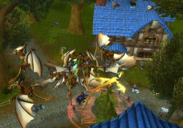 Submitter Ysabéll of The Evil Dead on Malygos (US-A) writes, "After providing the denizens of Goldshire, Northshire and all the forests and roads in between with the most impressive Mammoth Train ever, several of our group decided that the presence of the Darkmoon Faire warranted not one, but two (!) mount parties. Bronze Drakes ensued." Ah, the Bronze Drake. The lazy man's dragon mount.