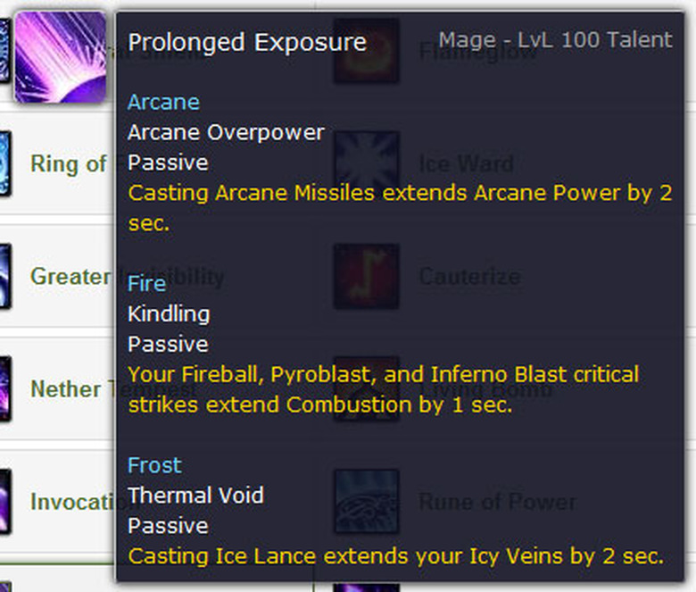 First up is the talent Prolonged Exposure. If you're an arcane mage, the talent Arcane Overpower makes it so that casting Arcane Missiles extends your Arcane Power by two seconds. For fire, the talent becomes Kindling: your Fireball, Pyroblast, and Inferno Blast critical strikes extend Combustion by one second. Finally, for frost the talent becomes Thermal Void, and casting Ice Lance extends your Icy Veins by two seconds.