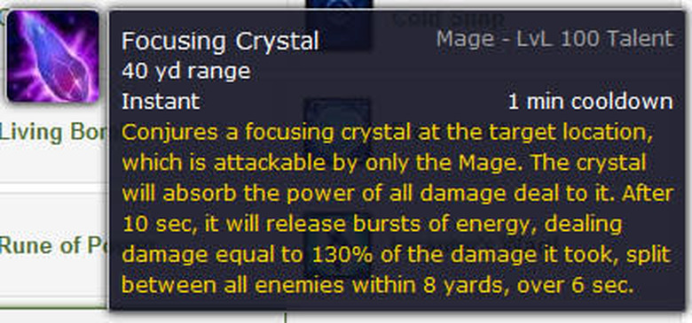 The next talent in the tier is called Focusing Crystal, and it's a really interesting concept. It's pretty simple: You summon a focusing crystal at a specific location. For the next ten seconds you can load it up with spells by attacking it. It absorbs the damage that's dealt to it, and after the ten seconds has expired, it releases bursts of damage equal to 130% of the damage it had stored, over six seconds to all enemies within 8 yards. This promises to be a powerful AoE cool down if used correctly. It's available once every minute.