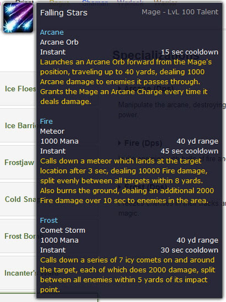 The overall theme of this talent is "dropping things onto/through other things." It behaves pretty differently depending on spec. For arcane, it grants the ability Arcane Orb, which launches an Arcane Orb forward from your position, traveling up to 40 yards, dealing 1000 arcane damage to enemies it passes through. It grants an Arcane Charge every time it deals damage. As fire, you gain Meteor, calling down a meteor that lands at the target location after three seconds, dealing 10K fire damage split evenly between all targets within 8 yards. It also burns the ground, dealing an additional 2000 fire damage over 10 seconds to enemies in the area. Finally, this talent gives frost the ability Comet Storm, described as calling down a series of 7 icy comet on and around a target, each of which does 2000 damage, split between all enemies within 5 yards of its impact point.