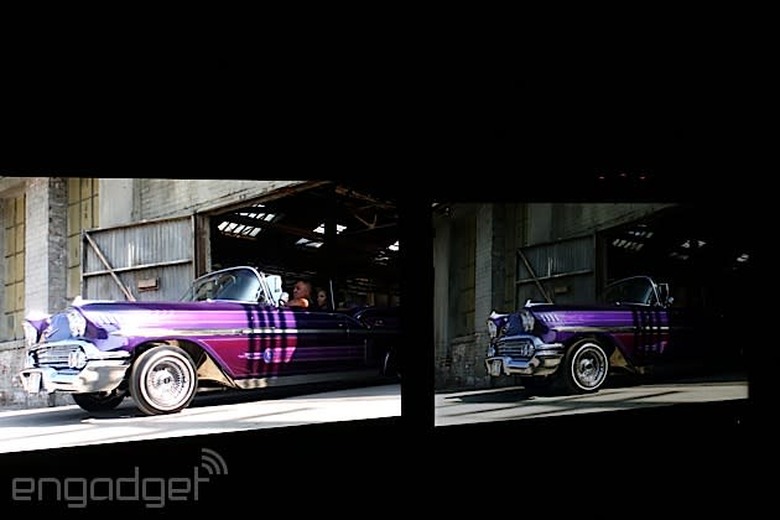 Dolby showed us a prototype of this experimental tech, which we're told will likely be exhibited at CES next month (either in prototype or in a consumer product, though this will be up to individual manufacturers). The 2K panel sat next to a production monitor that many filmmakers use as their current reference — in other words, what they use for viewing their footage before it goes through the process of compression and other tweaks — and the difference was night and day. Despite the fact that both monitors have the same resolution, the prototype (on the left in the above image) offered far more realistic colors, higher dynamic range and more contrast sensitivity, all of which were factors that created a fantastic viewing experience. As an example, the skies were bluer on the new monitor, and clouds that were barely noticeable on the production model actually popped out far more accurately on the prototype.