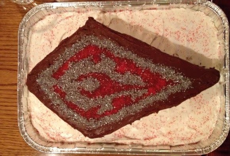 For the curious, the top layer that's the Horde logo is a white cake with chocolate frosting, and the bottom layer is a chocolate-banana cake with white frosting on the bottom. I don't have the exact recipe, but I requested it as a delayed wedding gift from the baker.