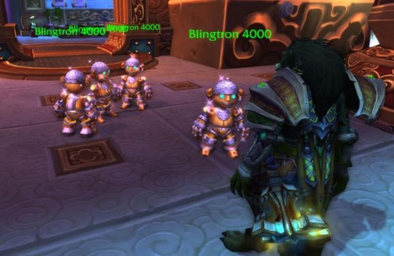 My God. The Blingtrons are breeding. Hold very, very still, young worgen. They can sense fabulousness, and that mace of yours is giving it off in spades. That cape, too, and ... are those emeralds embedded in your shoulderpads? Quick! You've got to shift into cat form and stealth away, or else your pelt will end up bedazzled with rhinestones and offered as part of their mid-winter collection. (Thanks to submitter Lughnasadh of Les Loyales on Shadow Council [US-A] for the screenshot!)