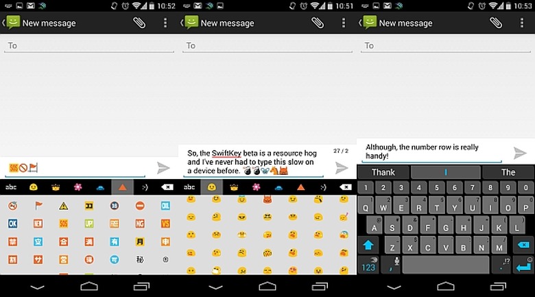 If you've been aching for more emoji on your Android device, the SwiftKey team has something right up your alley. The popular Android keyboard's latest beta brings more than 500 of the adorable symbols to your device of choice and can even autopredict emjois, just like it does for regular ol' words. What's more, the test-version also adds a dedicated number row in case you're one of the long-press averse. Of course, this is still a beta and your experience may vary once you side-load the APK. We tested the app on a Nexus 4 and found it was laggy to the point of being almost unusable, squashing our dreams of recreating Katy Perry's "Roar" video like a grape.