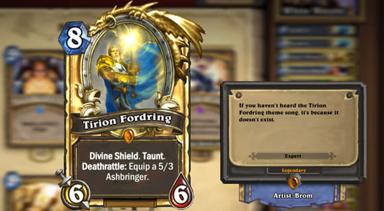 Tirion Fordring – If you're playing any sort of paladin deck, craft this 6/6 stud ASAP. No reason not to create him. He'll trade for more than one since he comes out with a divine shield. His taunt will ensure nothing gets by him (without making the opponent pay for it). If he dies, you get a 5/3 weapon in your hand that's good for 15 total damage.