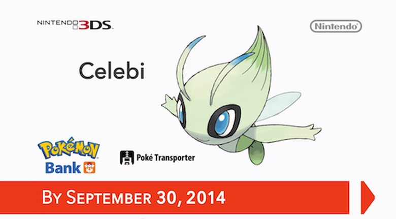Pokefans that download the Pokemon Bank storage app for Pokemon X/Y and access their Pokevault by September 30 will be offered a free Celebi, this morning's Nintendo Direct announced. Nintendo President Satoru Iwata noted that Celebi will "also available during the free trial period" for the storage app, so you won't need to pay the annual $4.99 fee to get your legendary Pokemon.