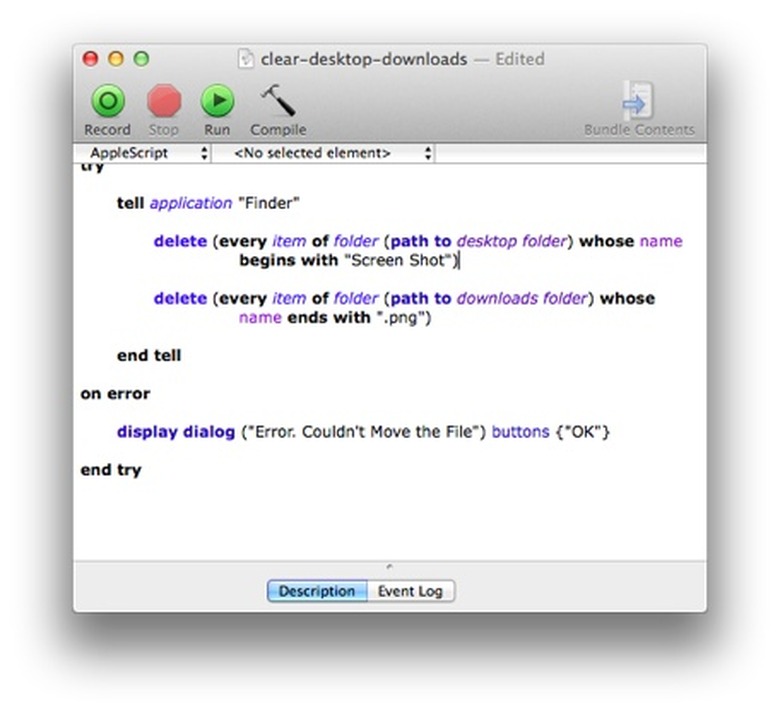 You can modify it yourself to point to a different folder or to target different files. If you remove the qualifier "whose name begins with" and leave the line as "delete (every item of folder (path to desktop folder))", then you can delete all the contents of a folder in one fell swoop.