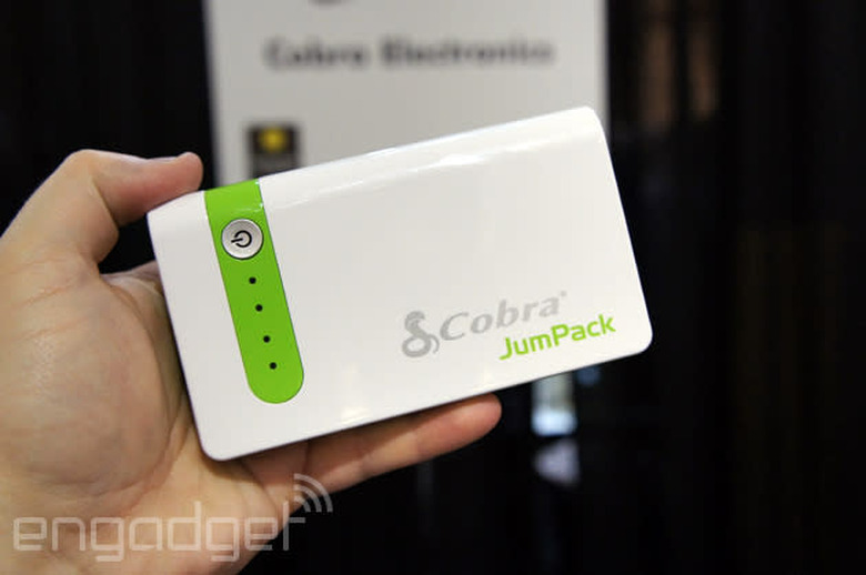 Cobra Electronics is a big player in the automotive world, largely thanks to its line of radar detectors. What a lot of people don't know, however, is that the company has also been dabbling with products that jump-start your car. At this year's CES, Cobra is introducing the JumPack, which it says is a game-changing device for jump-starting — an odd-sounding statement, no doubt, but we have to agree. The 7,500mAh portable JumPack (CPP 7500) looks suspiciously like your run-of-the-mill external smartphone/tablet charger, and it's the smallest jump-start power pack we've come across. It features a 200A starting current and gets up to a peak current of 400A, which is enough to give your car's battery a few jumps — given that it only takes three to four hours to recharge, it should be more than enough to manage those unfortunate situations in a lonely parking lot. It also comes with a built-in flashlight as well as USB output (2.1A) in case you want to give your smartphone a power boost. When it makes its way to stores in March or April, you'll be able to pick one up for $130.