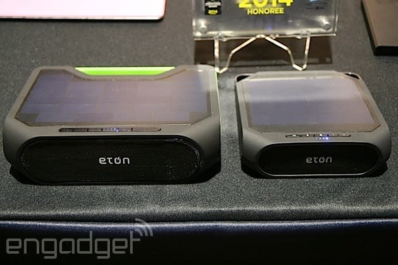 That pair of new solar-powered speakers from Eton that we told you about today just had their public unveiling at CES Unveiled, here at Vegas. So, you're no doubt asking, what makes the Xtreme so Xtreme? Ruggedness, of course. The speaker is water-resistant and can be dropped from a height of 3.3 feet. The wedged-shaped speaker is a pretty nice-looking thing and feels solid in-hand, even with those rubberized edges. As for sound, well, quality seems halfway decent, though the speaker doesn't get particularly loud. In this crowded room, we had to get pretty close to hear things clearly.