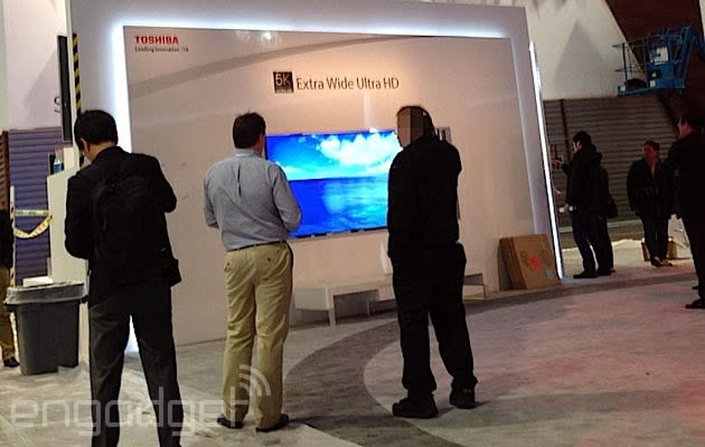 4K? Pah, Toshiba's already working on something, you know, one better. One of our eagle-eyed readers sent in this picture of a "5K" extra-wide UHD TV on the show floor. Of course, like LG's 5K model, this is really just a 4K TV with a thousand extra pixels tacked on at the edges, but the plain technical facts shouldn't detract from this spectacular work of corporate one-upmanship. Naturally, we'll probably find out more about this hardware in a day or so, but until then, we'll just have to gaze upon this slightly blurry shot and wonder.
