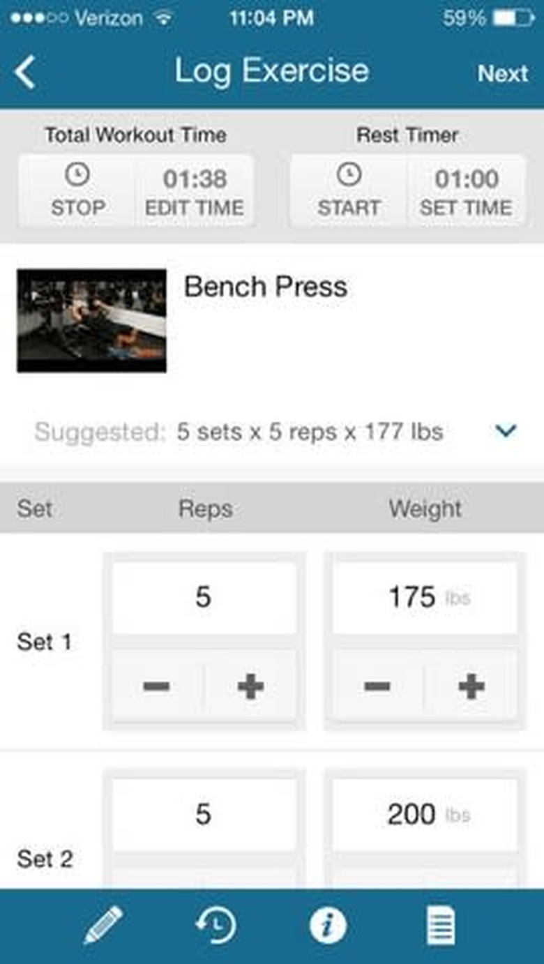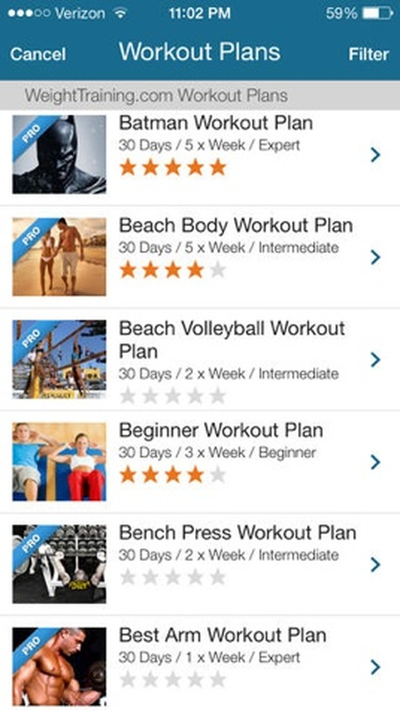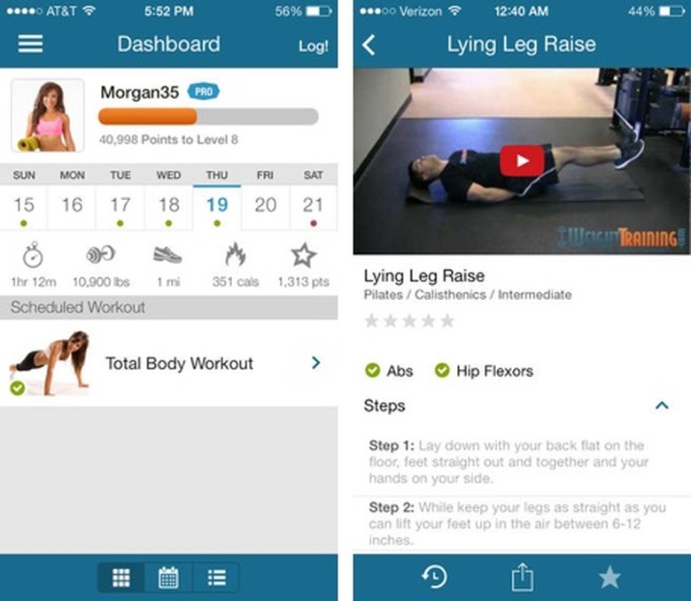 The WeightTraining app has a decent database of exercises that range from beginner to expert. Each exercise is rated for difficulty (beginner, intermediate or expert) and includes photos as well as step-by-step video tutorials. The videos are very helpful for beginners who need help with an exercise or experienced exercisers who need a refresher. If you need personal assistance with your goal, there's even an option for Pro members to talk to a personal trainer.