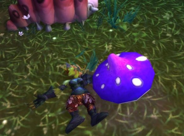 Submitter Bruin of Silver Hand (US-H) stumbled upon this unfortunately deceased Alice in Wonderland goblin cosplayer while questing. Turns out that hookah-smoking caterpillars aren't the best judges of which mushrooms are and aren't poisonous. (Hint: bright colors are nature's 'do not eat' sign.) The rare mushroom might send you on a magical adventure, but a lot more will just cost you repair money.