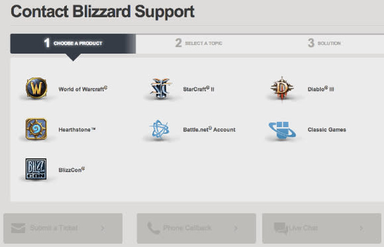 You can submit a ticket at any hour, but phone support and live chat are only available during specific times of day, depending on your region. No matter which method you prefer, you'll start by going to the Get Help page for North American and Oceanic realms or European realms. You'll have to answer a few questions about the problem you're having and before Blizzard will connect you with a support rep, they'll try to help you immediately by linking you to some relevant support articles — but if you've gotten to this point, you've probably already checked them out. To move forward, just select how you'd like to contact support — whichever method you choose, Blizzard is pretty good at getting back to you quickly, so just be patient.