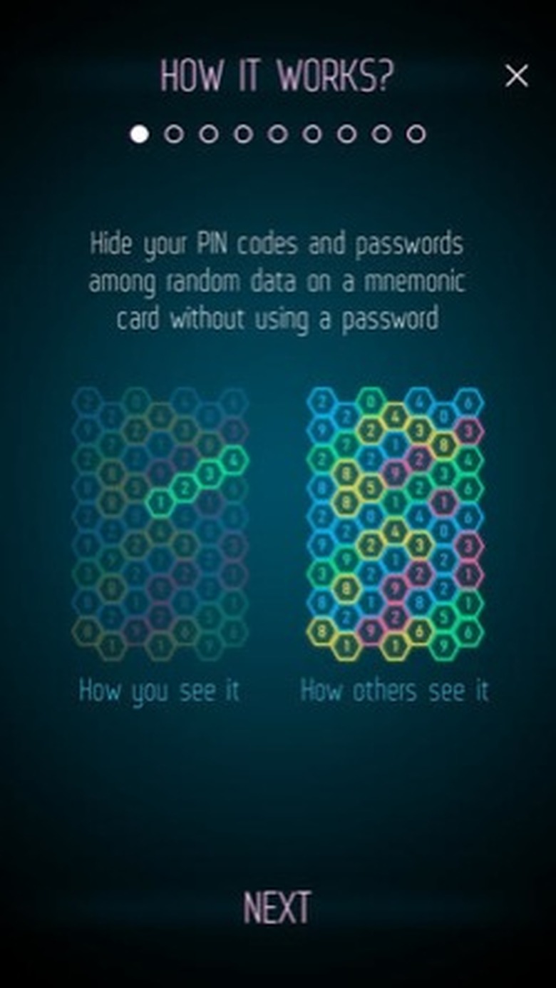 The app works by providing a random data generator, which surrounds your PIN codes and passwords with similar-looking elements. You pick the pattern and enter your custom data by editing whichever cells you desire.