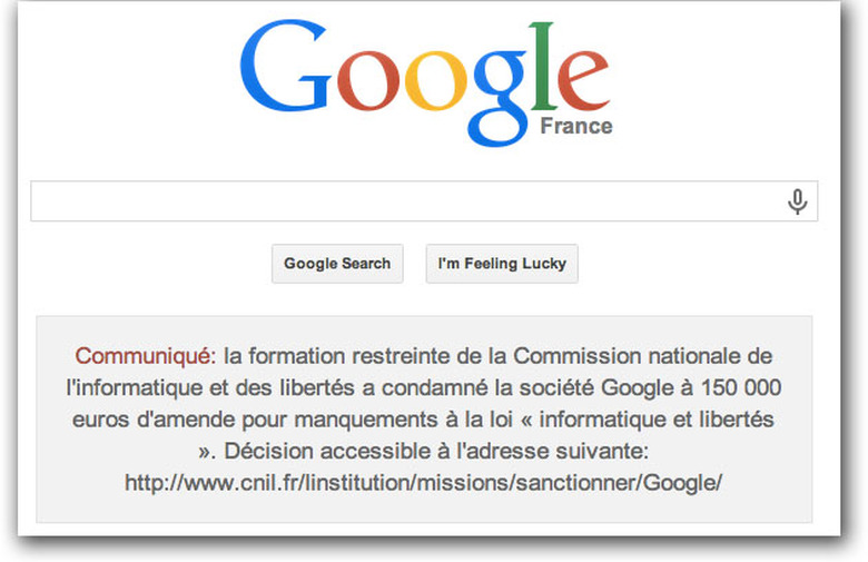 France and Google are playing a delicate game of brinkmanship in the courts of Europe, and it still isn't clear who'll come off worse. France fined the search company €150,000 ($200,000) last month as a penalty for failing to tell French citizens exactly what happens to their personal data. Google could have coughed up the trivial sum and drowned its sorrows in a bottle of beaujolais, but instead it has decided to fight — not because of the money, but because accepting the fine would have also involved making a public admission of guilt (published below the search button in a size 13 font, no less) and the company feels this would have "irreparably damaged" its reputation.