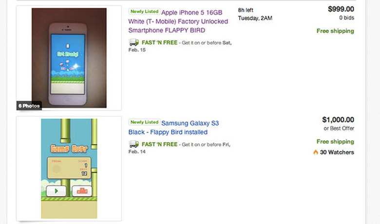 Less than a day after the explosively popular game Flappy Bird vanished from the App Store and Google Play, it's become available on eBay — for hundreds of dollars. Lucky owners of the Flappy Bird app have put their phones and tablets up for bidding, with prices ranging from $460 for a black iPhone 4s with an "updated" version of the game to $1,000 for a Galaxy Tab 3 with the app pre-installed.