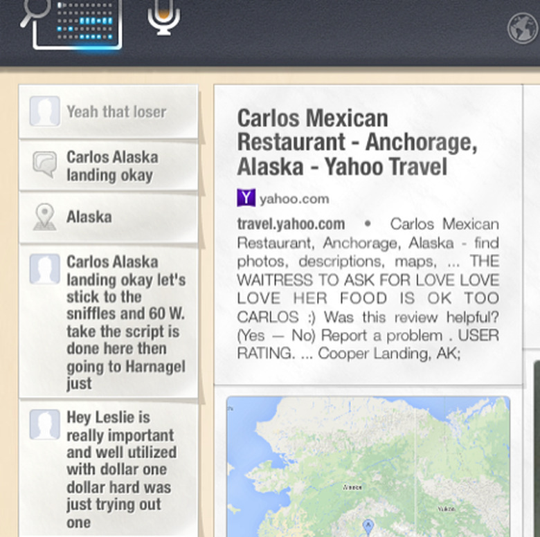 Oh man how I wanted to love MindMeld. This US$3.99 app basically has one of the coolest premises ever. It listens to your conversations, interprets what you are saying, and pre-emptively pulls up web-based content as you talk. Bits and bobs tied to your conversation topics appear as if by magic, providing instant gratification contextually linked to the ongoing discussion.