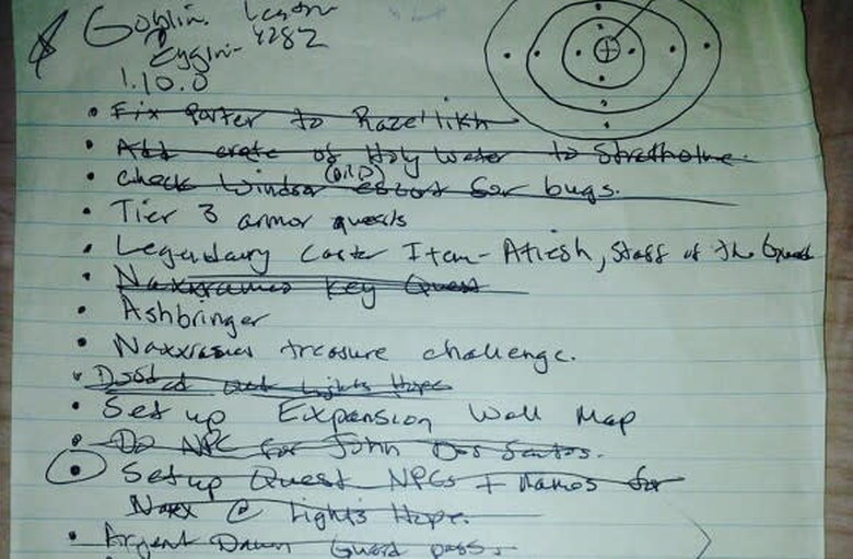 Next up, as an extra treat, Alex posted the to do list we see above, which you can view in all its glory on Twitter. He also issues a challenge, asking readers to spot what didn't make it to fruition. What can you see? I can certainly see a couple of lines that I can barely make out... Repeatable something something for Silithus? Hard to tell. And if you want to follow the Blizzard team on Twitter to see these for yourselves, WoW Insider posted a guide to Blizzard's Twitter accounts.