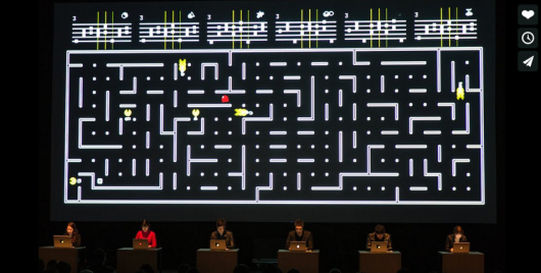 "Six Pacmen" is a performance piece from Tacit Group that fuses the arcade game Pac-Man with the 1973 musical composition "Six Pianos" by Steve Reich. In this twist on the Namco classic, the song "Six Pianos" is played one measure at a time. Players must move their Pac-Man character around a shared level with five other players, each working to collect an object in the maze. Once a set of objects has been collected, the song advances to the next measure of the song.