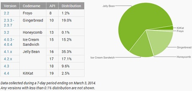 Measured against Android, note that just 2.5 percent of Android devices are currently running KitKat, the most recent iteration of Android. Indeed, most Android devices today are now running variants of Jelly Bean, which was initially released back in July of 2012.