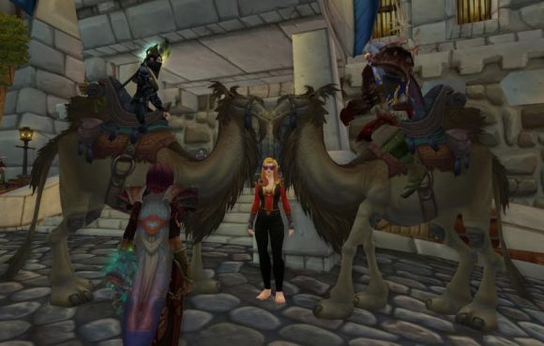 In a world full of people wearing robes, cloaks, horned cowls, and anything and everything covered in spikes, it's surprising to see someone dressed like an actual human being. Assuming that one counts the Real Housewives of Anywhere as human beings. I admire her bold choice in sunglasses, but even Kim Kardashian wouldn't hire two camels to accompany her everywhere she goes. And going barefoot is only appropriate on the beach. Or if you're me, who only owns a pair of steel-toed work boots and sandals, and thus got married wearing no shoes at all. (Thanks to submitter Yseora of Fights Like a Girl on Blackwater Raiders [US-A] for the screenshot!)