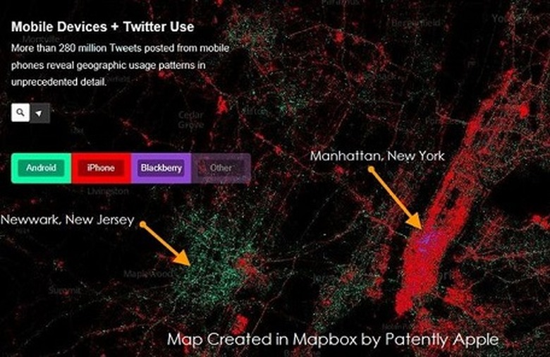 Patently Apple shared the above map this week that shows Twitter usage in New York and New Jersey broken down by smartphone device. The photo above clearly shows that the iPhone is the smartphone of choice in Manhattan, though there remains a small stronghold of financial types in Midtown who apparently remain beholden to Blackberry. Newark, meanwhile, is extremely Android-centric.