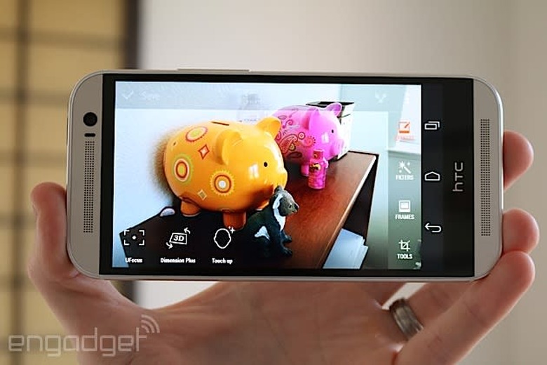Frankly, it'd be silly to have extra hardware on a phone that's completely unusable, so the Google Play edition will still take advantage of the Duo Camera functionality. Predictably, the app itself is the stock Google version, but the HTC magic comes out as soon as you enter the Photos app and try editing your shots. You'll be prompted to open up "HTC Photo Edit," and you'll see a screen that looks much like what you'd find in the Sense gallery, but with fewer options: UFocus, Dimension Plus and Touch Up are the only Duo Camera-esque effects listed, which means the Foregrounder, Seasons and Copy/Paste functions didn't make the cut. (Filters, frames and tools are still hanging out on the right sidebar.) UFocus is our favorite of the Duo Camera options, so we're glad to see it there, but Dimension Plus is a useless and gimmicky feature that we just don't use very often.