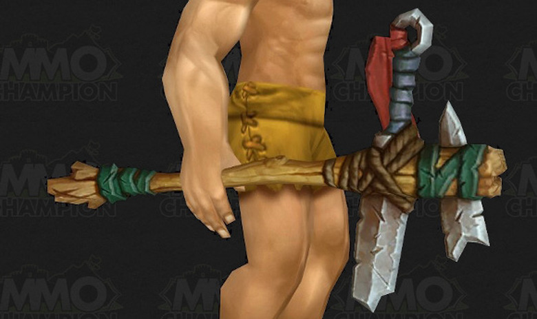The Warlords of Draenor alpha has been datamined and we're seeing things like new models, and some of those have been item models. And frankly, these models have me curious about how the Iron Horde weapon development process works. So far, there seems to be three or four camps – there's the recycle broken weapons (like you can see above and with this sword, which frankly I don't believe for a second would actually work twice), the stick a jawbone on it model, multiple varieties of trees. There are rocks on sticks, there's this thing which I think is supposed to be an enormous horn or tooth tied to a stick, and so far none of it requires Garrosh Hellscream to step through a dimensional portal to give you the secrets of this miraculous technology.