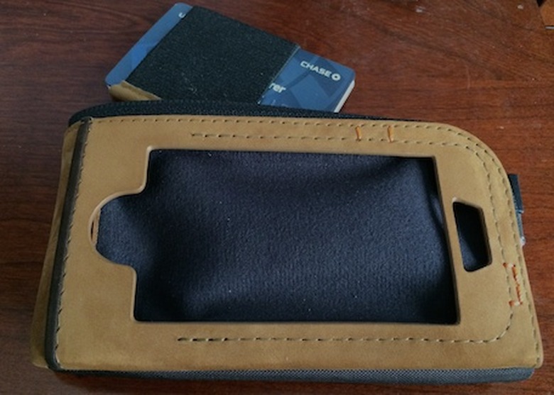 The inside of the CAZLET is the amazing place — like the TARDIS, it's a lot bigger on the inside. On one side you can see the Cordura that holds the iPhone in place. In the center "spine" of the CAZLET you'll find an orange hanging strap, while the other side has the wallet and holds accessories. The review CAZLET came with all of the goodies, including the coin pocket, hand strap, ID sleeve, card band (holds a bunch of credit/debit cards together) and a cleaning pad. There's also a SIM removal tool option, and a tiny "nook" for a SIM card.