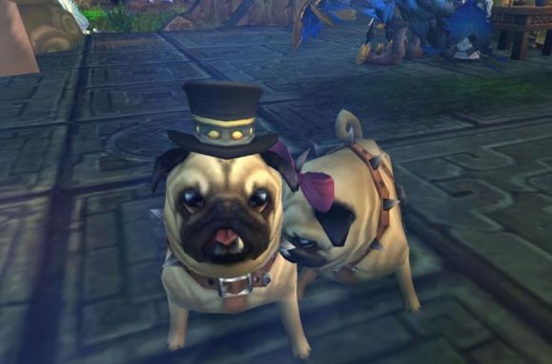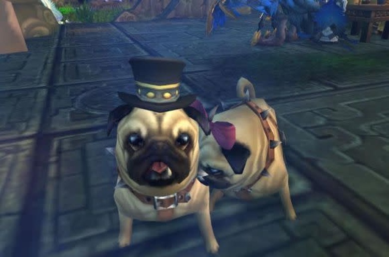 Aaaah, look at the adorable pugs, all dressed up and out on a date! See how she nuzzles his neck with her soft jiggly-wiggly velvet face! Surely there could be nothing sinister in such a display, could there? Of course not. That feeling of a rogue behind you about to steal your gold before sliding a knife between your ribs is just a paranoid delusion. Just keep looking at the puppies and no one has to get hurt ... more than necessary, that is. (Thanks to submitters Zendara and Scourgehoof of Assume the Position on Zul'jin [US-H] for the screenshot!)