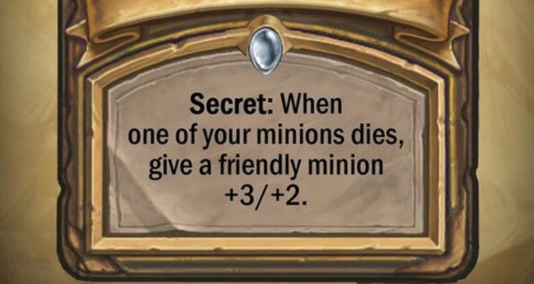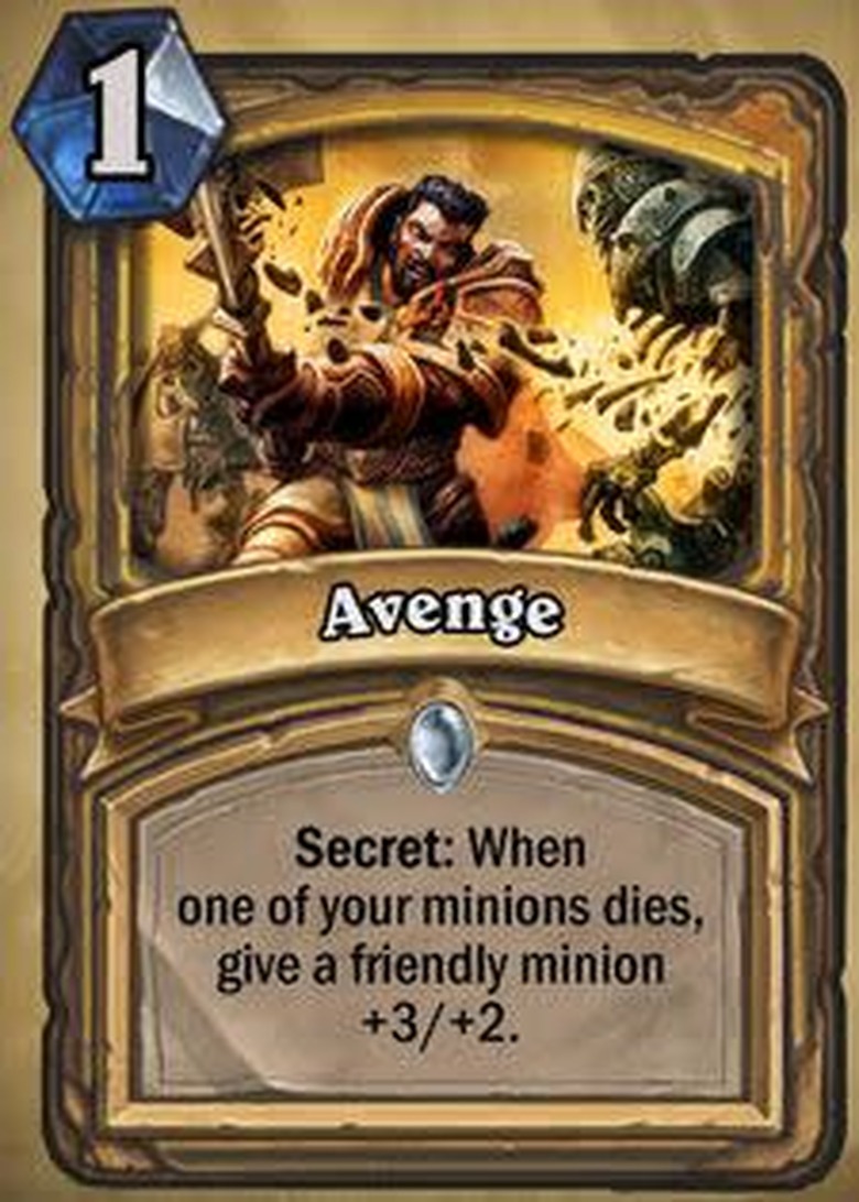 Revealed last night, a new Paladin card in the upcoming Hearthstone expansion Curse of Naxxramas, is just asking to be used in every single Paladin deck out there. The card, "Avenge," has the secret of "When one of your minions dies, give a friendly minion +3/+2." I am sure that games will be won on this card alone, and that those suffering the loss will want to avenge something themselves.