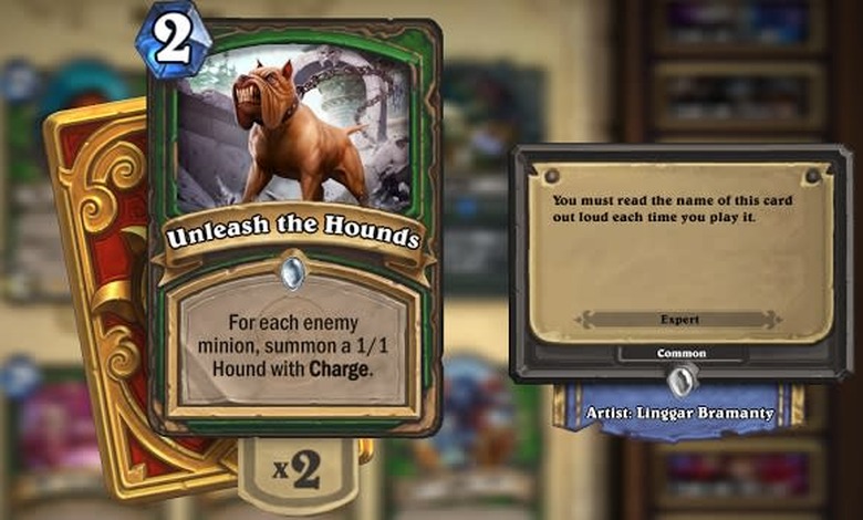 CM Zeriyah has announced that the mana cost for the hunter card Unleash the Hounds will be changing from 2 to 3 in an upcoming patch. Since Hearthstone came out of beta, Blizzard hasn't made any card balancing changes, but this card's power — Hearthhead suggests the card is in 74% of hunter decks, and we honestly have to wonder about the 26% of decks that don't include it — made the change necessary.