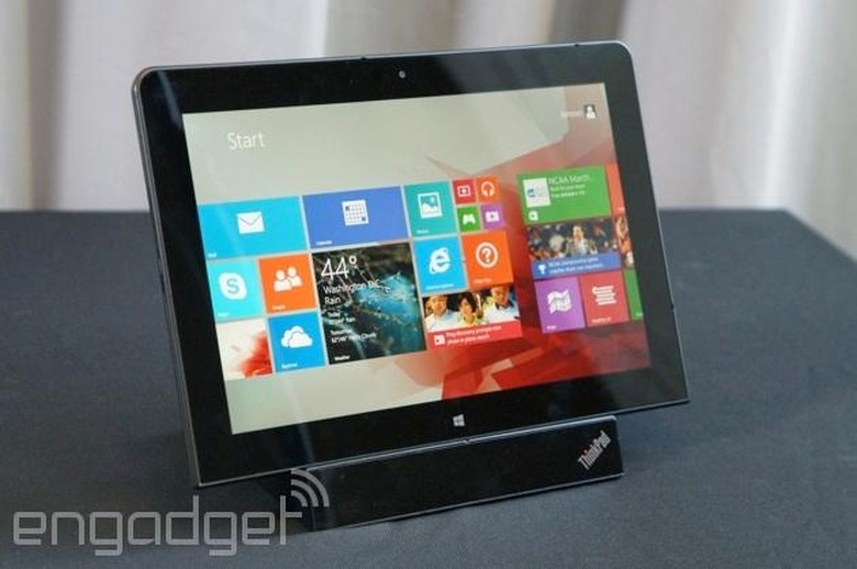 Some companies throw gadget spaghetti at the wall to see what sticks. Others... keep the same tablets around for nearly two years. We've seen Lenovo be both those companies, frankly, but when it comes to its business line, at least, it tends to move at a more glacial pace. Case in point: Nearly two years after announcing the ThinkPad Tablet 2, Lenovo has finally unveiled its successor, the previously leaked ThinkPad 10. Even then, it feels like more of the same: a 10-inch tablet with an Intel Atom processor, dual 2MP/8MP cameras and a 10-hour battery. This time, though, it brings a sharper, 1,920 x 1,200 display, effectively matching rival tablets in this price range. Like its predecessor, it'll be offered with options for pen support, TPM, 4G and fingerprint/Smart Card readers, though we're told most of those features, save for pen support, won't be available at launch. Under the hood, it runs Windows 8 Pro, with a quad-core Bay Trail CPU and 64GB-128GB of storage (expandable via microSD). Prices start at $599, with shipments starting sometime in June.
