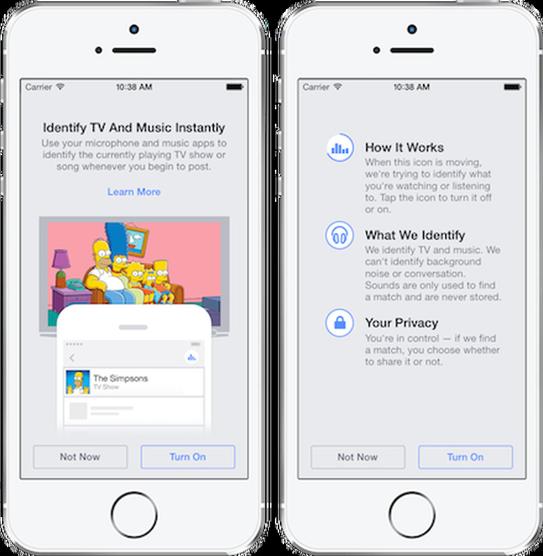 Having the app listen in to your environment sounds like a rather creepy proposition, but Facebook assures us that the app is only scanning for song and TV info and no sound is ever recorded or stored on its servers. You'll also always have full control over your posts and can decide not to share what it detects. In other words, you don't have to reveal that you were just watching My Little Pony if you don't want to.