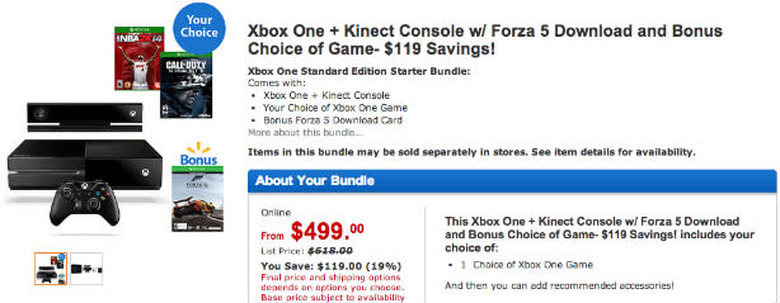 Wal Mart is offering $119 of savings on an Xbox One bundle: You can grab the console (with Kinect), a digital copy of Forza 5, and a choice of whatever game you want for $500. There are 18 Xbox One games to choose from for the free option, including Titanfall, Call of Duty: Ghosts, Battlefield 4, Assassin's Creed: Black Flag, NBA 2K14, Thief and Metal Gear Solid 5: Ground Zeroes.