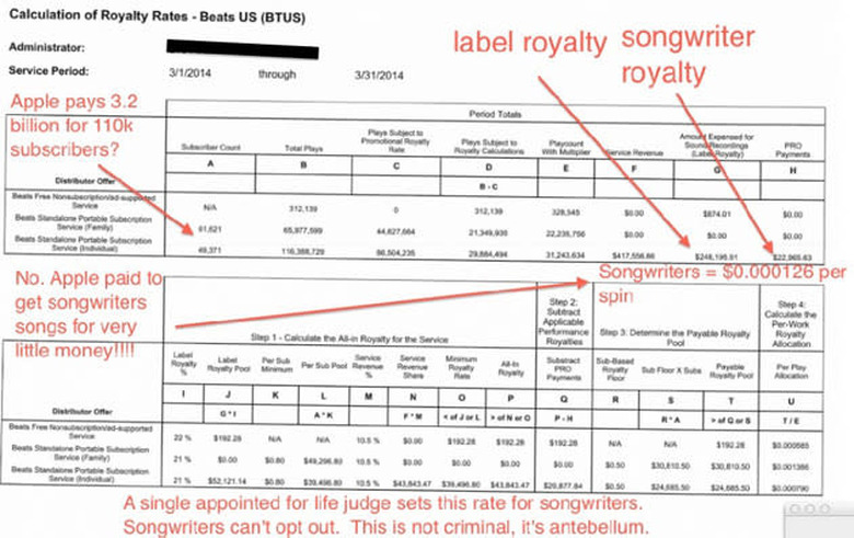 The same site that leaked Beats' subscriber figures also points to another interesting figure — the low amount of royalties that Beats pays to songwriters (approximately $0.000126 per play). Beats has previously stated that its strategy is to make sure content owners get a good deal and to work with them more closely than other services. So, in many cases that content owner could well be the songwriter. But, this is, perhaps, a good indicator of where the purchase of Beats Music offers its best return, and where Beats co-founder Jimmy Iovine's reported industry sway could really pay off. Has it paid off to the tune of $3 billion? Well, that's the million (billion?) dollar question.