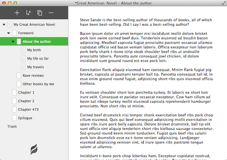 Developer John Plewe of Nevercenter Ltd. (also known for the popular CameraBag 2 and Silo Mac apps) says that he wrote Leafnote for his own use. Plewe says that "I'm a developer and wannabe author, so it's mostly designed from the perspective of keeping my ideas and half-finished stories around, or letting novel projects slowly grow over time." And that's a good description of how Leafnote works; it has an easy organizational tool for focusing on parts of an overall project.