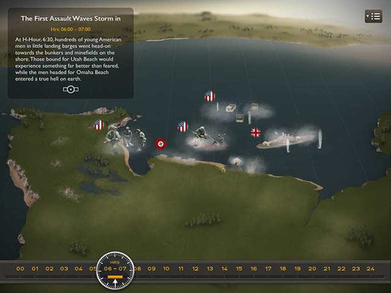A case in point is D-Day Hour by Hour, a US$4.99 app that lets you explore maps, articles, audio interviews and newsreel videos. The iPad app features a timeline at the bottom, and as you slide it you will see positions of allied and Nazi troops change, and get featured content that also covers the run-up to the D-Day invasion and historical facts about the aftermath.