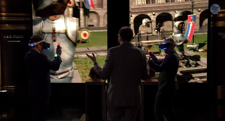 We got our hands (and face) on Project Morpheus during GDC 2014, and we played the same demo, though with slightly fewer exclamations of insanity. Maybe Fallon and Tatum's suped-up excitement had something to do with the martinis they sipped beforehand. Drunken dragon slaying, anyone?