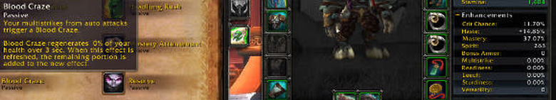 As you can see from the screenshot above, my amount healed by Blood Craze is at zero, and the amount of Multistrike I have on my leveling gear is also zero. So it seems that Multistrike, as a stat, is one that you get entirely from gear with no baseline benefit – either you have gear with Multistrike on it, or you don't, and if you don't than Blood Craze does nothing.