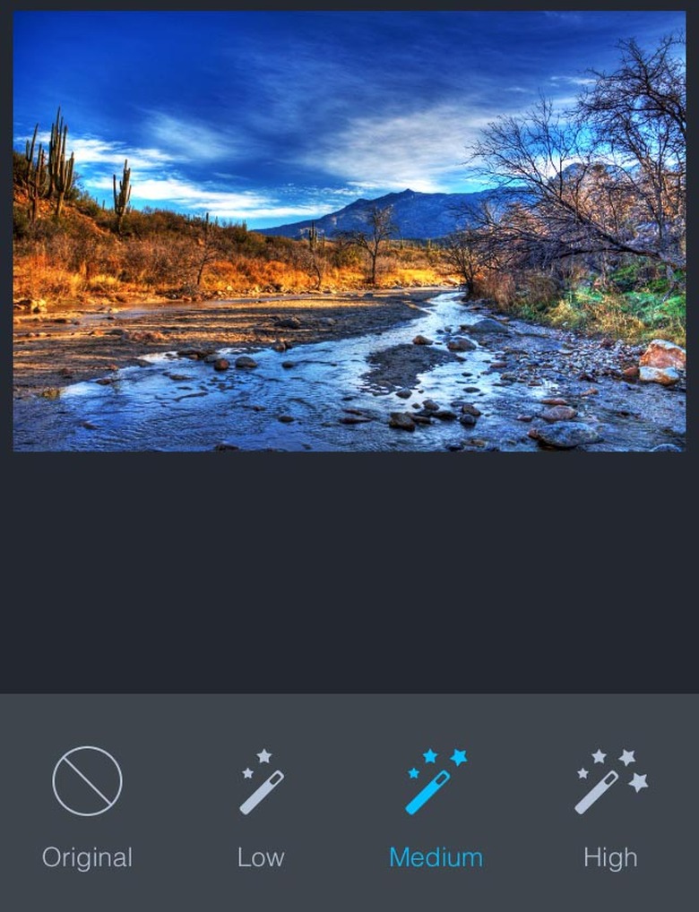 "Scenes" is another very nice feature. There are 13 different options to apply different enhancement parameters to a photo depending on where and when it was taken. There are scenes for cloudy days, landscapes, even photos of food. They all work well, and none goes so far as to wreck the original picture with too much enhancement.