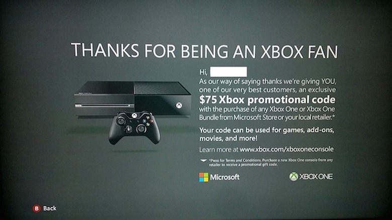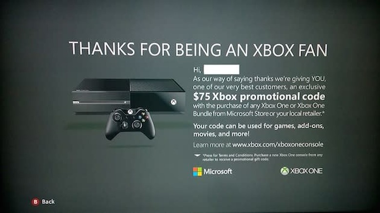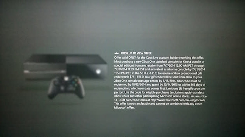If you've pondered buying an Xbox One, but have felt a sense of loyalty to your Xbox 360, Microsoft is very keen to help you make the switch. As spotted by user BeforeU on NeoGAF, the company is running a new promotion that gifts its "very best customers" with a $75 promotional code if they buy an Xbox One or any Xbox One bundle. It appears that not everyone is eligible for the offer, with Microsoft only targeting a subset of Xbox 360 owners across the US ahead of its July 31st deadline. However, there's no word on whether the promotion will come to other countries. To find out if you qualify, turn on your Xbox 360 and make sure it's connected to Xbox Live. If you've been selected, you can order a (full-priced) console from any retailer and Microsoft will credit your Xbox account with $75, as long as you redeem your voucher code by October 15th. That'll cover you for at least one Xbox One game like Destiny, ensuring your game collection gets off to a good start.