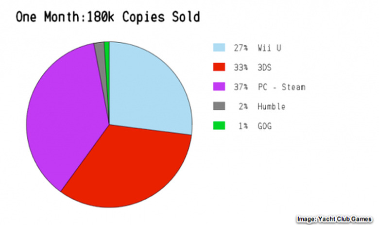 Taking out the 15,000 copies given to Kickstarter backers, which ended up being a third on Nintendo platforms and the rest on PC, the team sold 150,000 copies in its first month. First week sales were approximately 75,000, which blew the team's "2x-4x pre-sale expectation out of the water!"